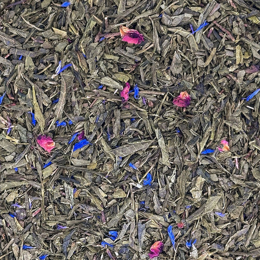 Thés verts, arômes, fleurs de bleuets, pétales de rose